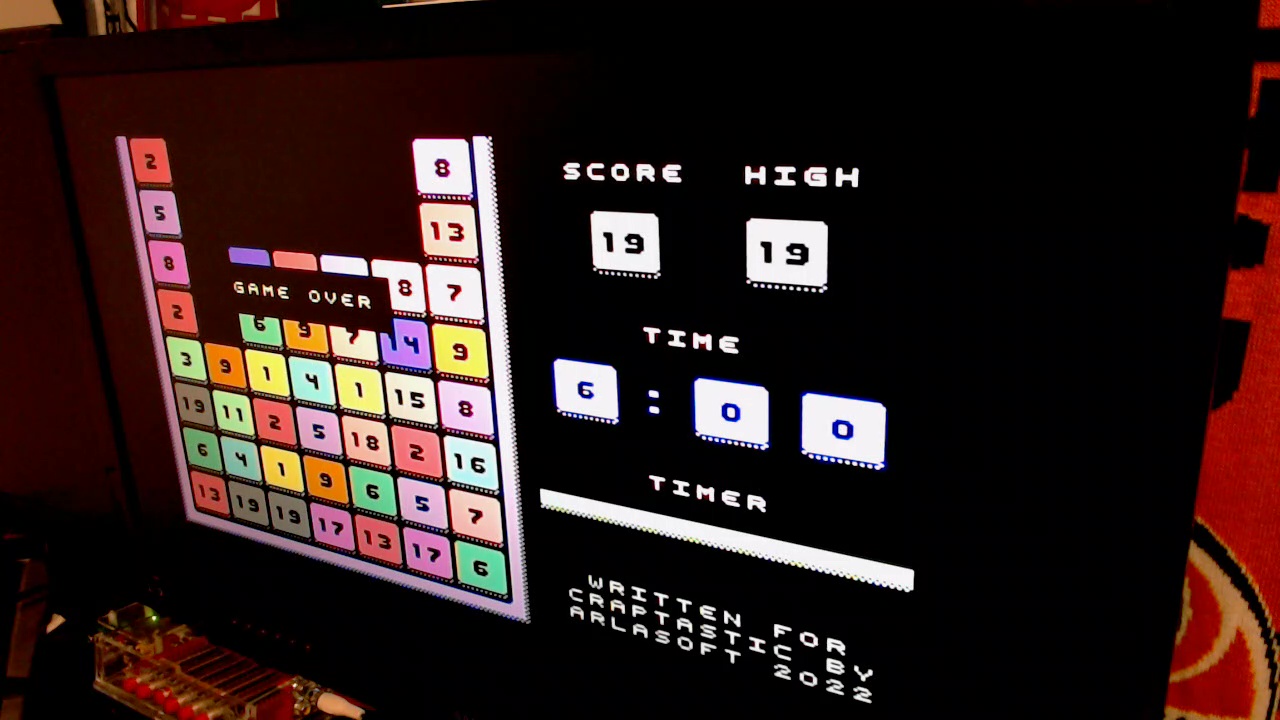 Play the game in 1 player mode with default settings. Free homebrew version available here: https://arlagames.itch.io/20-c64 |