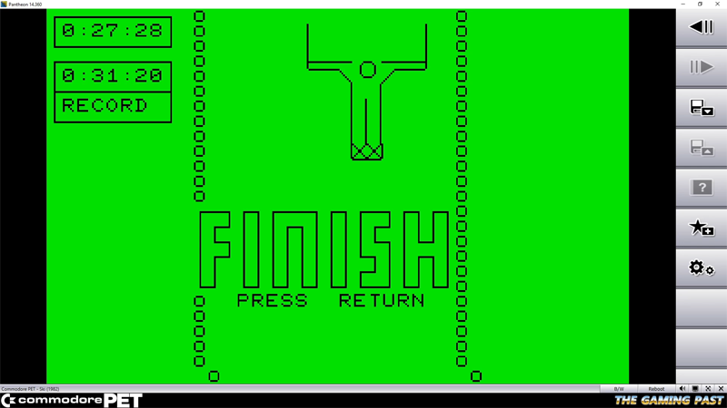 Your character is quite easy to control, but if you go off the edge of the course, you'll tumble to the ground. You can carry on, but you lose time. The tumble is done in an excellent way. The PET could only use its fixed set of characters - no user defined graphics were available - so the tumbling skier made using only the standard character set is beautifully done. The animation on the skier during his run is also worthy of note. Despite the simplicity of the game (and the machine it runs on), Mike has managed to bring his usual class to the program, including the nicely presented title screen.
