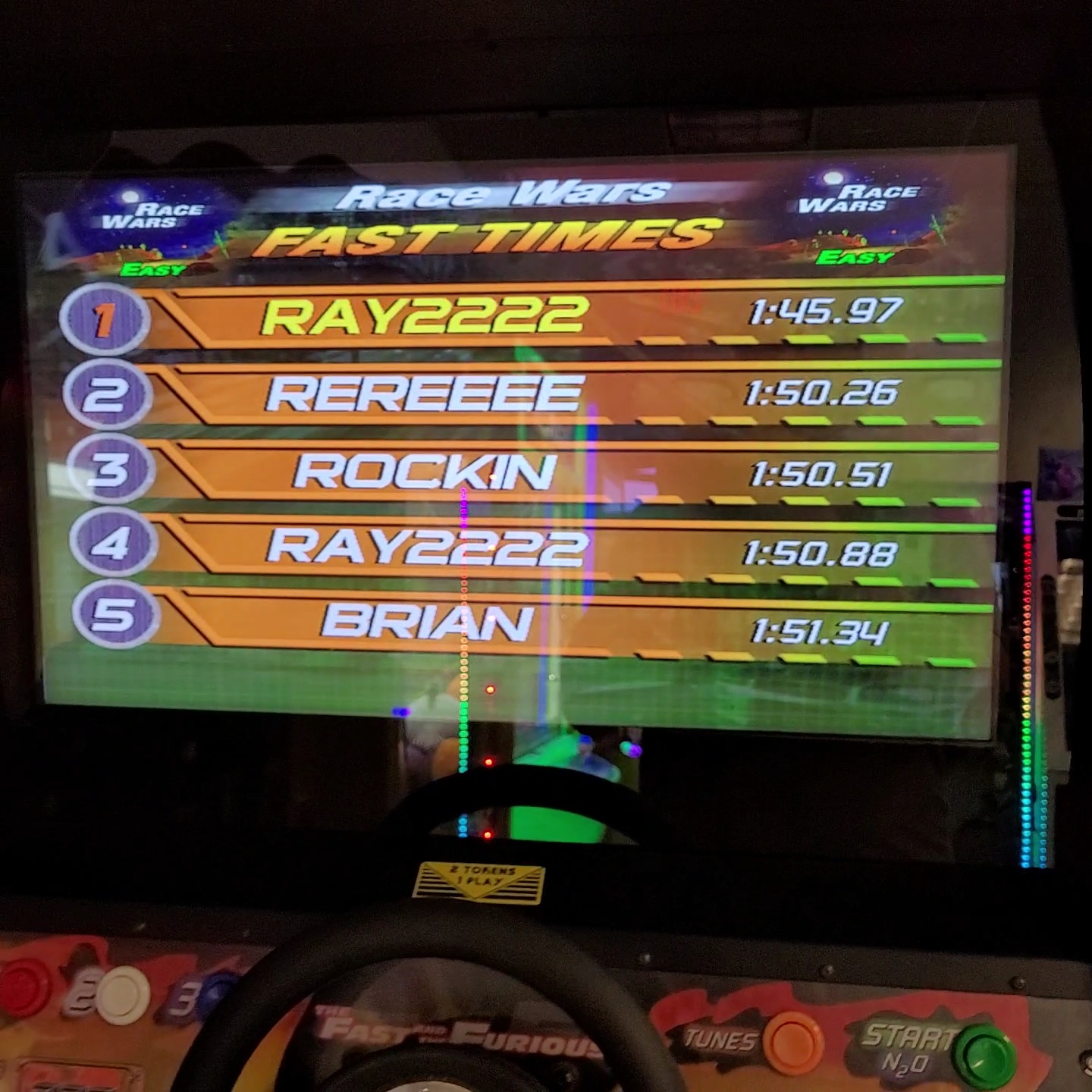 Looking back at my old time, 3 people at the arcade beat it since i was there.. So I had to get back on top. It took about 5 tries. The key is catching more air as it adds your air time , after the race it subtracts seconds from your race time as a reward for more air time. This stage has lots of opportunities for wheely jumps, the classic cruis'n double tap of the gas to launch you over on-coming traffic, and in this stage has many "car carrier" trucks that can be used as ramps. Lots of fun.