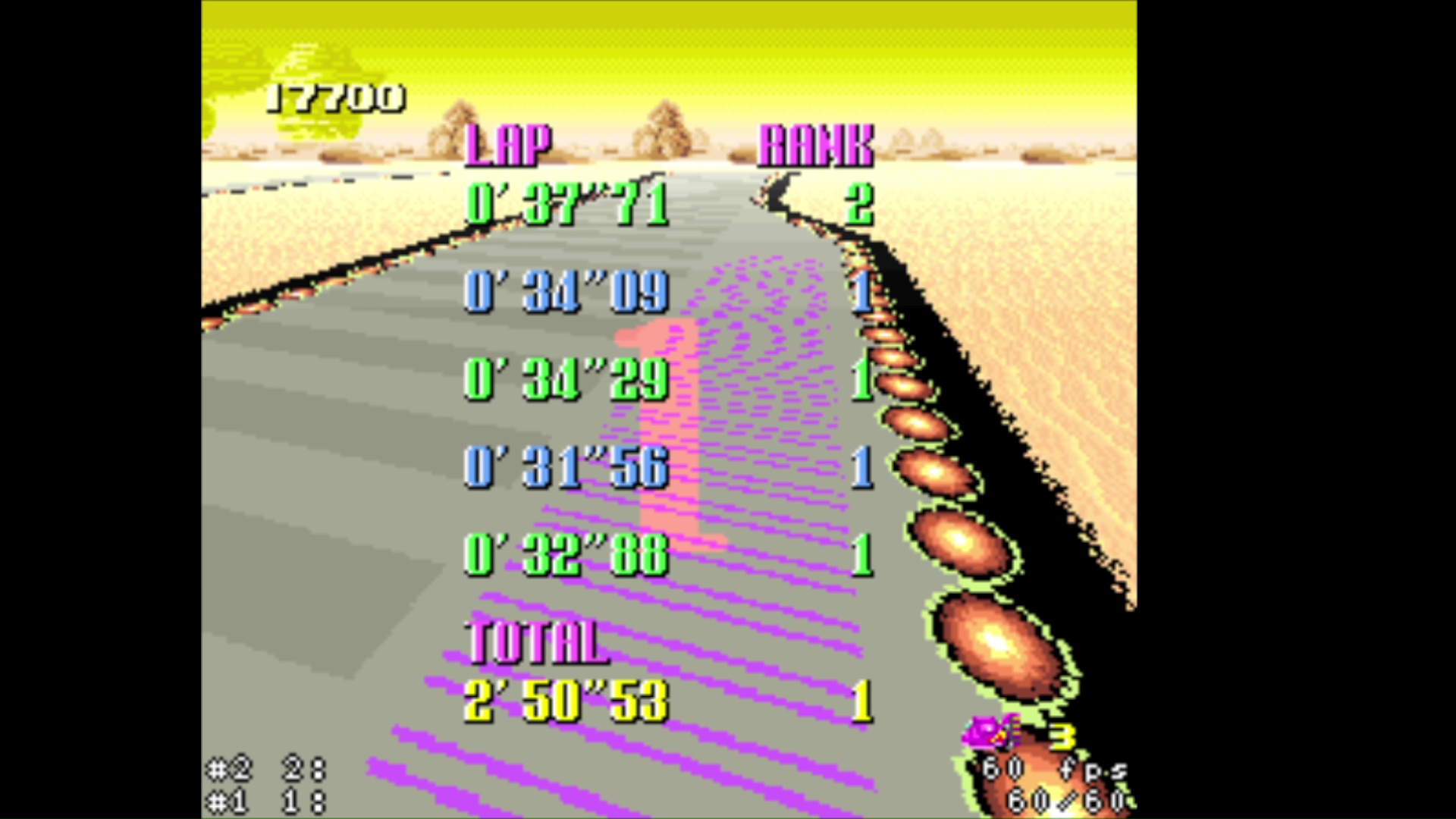 • zsnes (all versions) and snes9x emulators <=1.53 banned because inaccuracy in timing • super start allowed (pushed by other cars at start) • shortcuts allowed • practice mode: rival allowed • for best lap : use of 4 boosts on same lap allowed (1 just before the finish line on 4th lap and 3 others on last lap) • records menu is a mix of gp and practice time (pink = practice / blue = GP) • try again is allowed (3 lives = 3 retries maximum) • use of pause when the timer is started is forbidden • use of turbo button controller is forbidden |