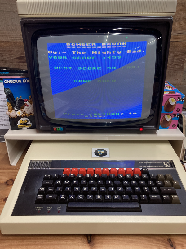 This game was played at the Retro Collective, Stroud, UK on the 4th October 2025, on their BBC Micro - there is an Acorn Atom sat on top of the monitor. There are no selectable skill levels in the game. The final score was 459 points.