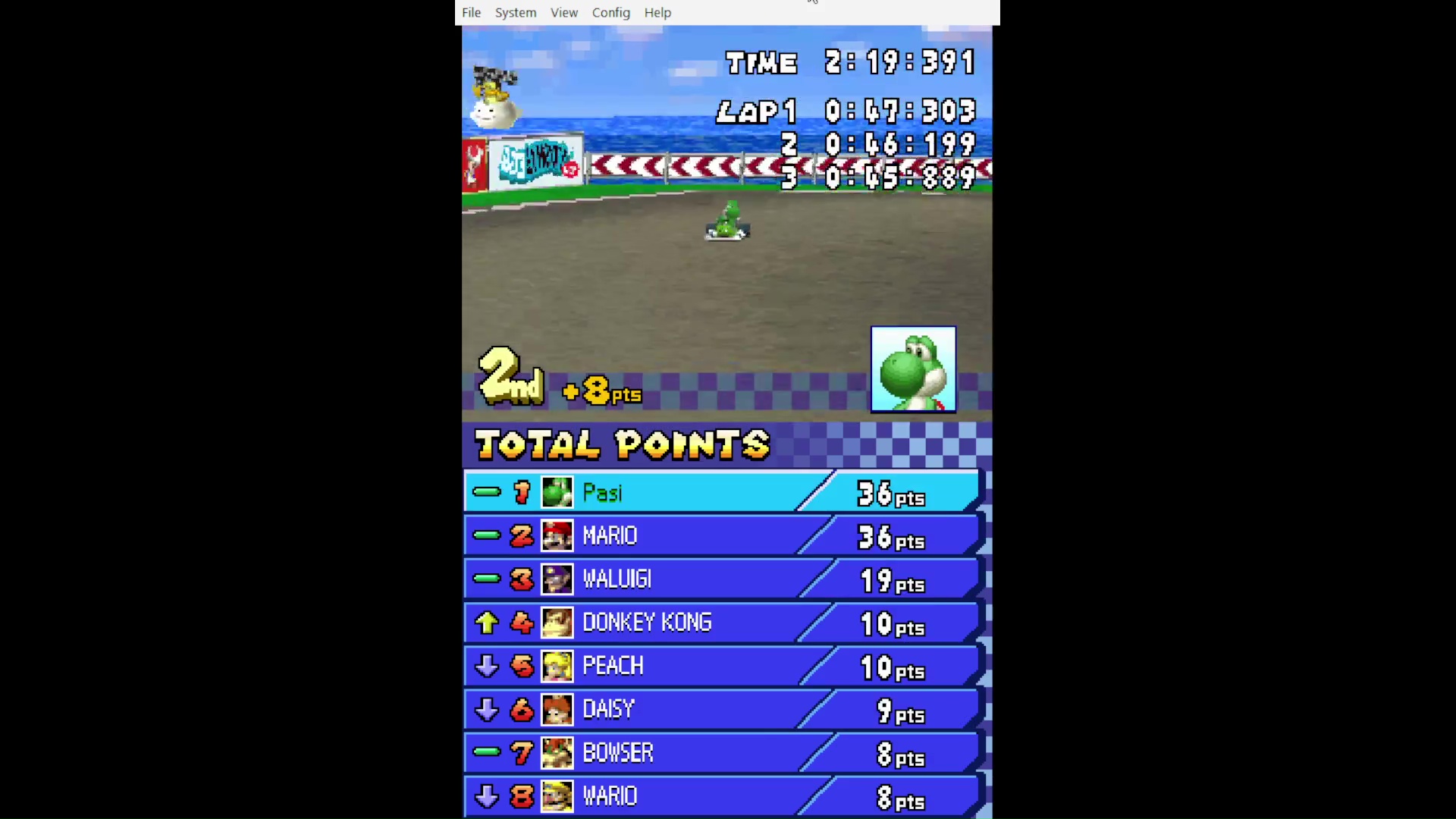 Emulation checked, game checked, Grand Prix / 150cc Mirror / Track checked, gameplay checked, time checked.