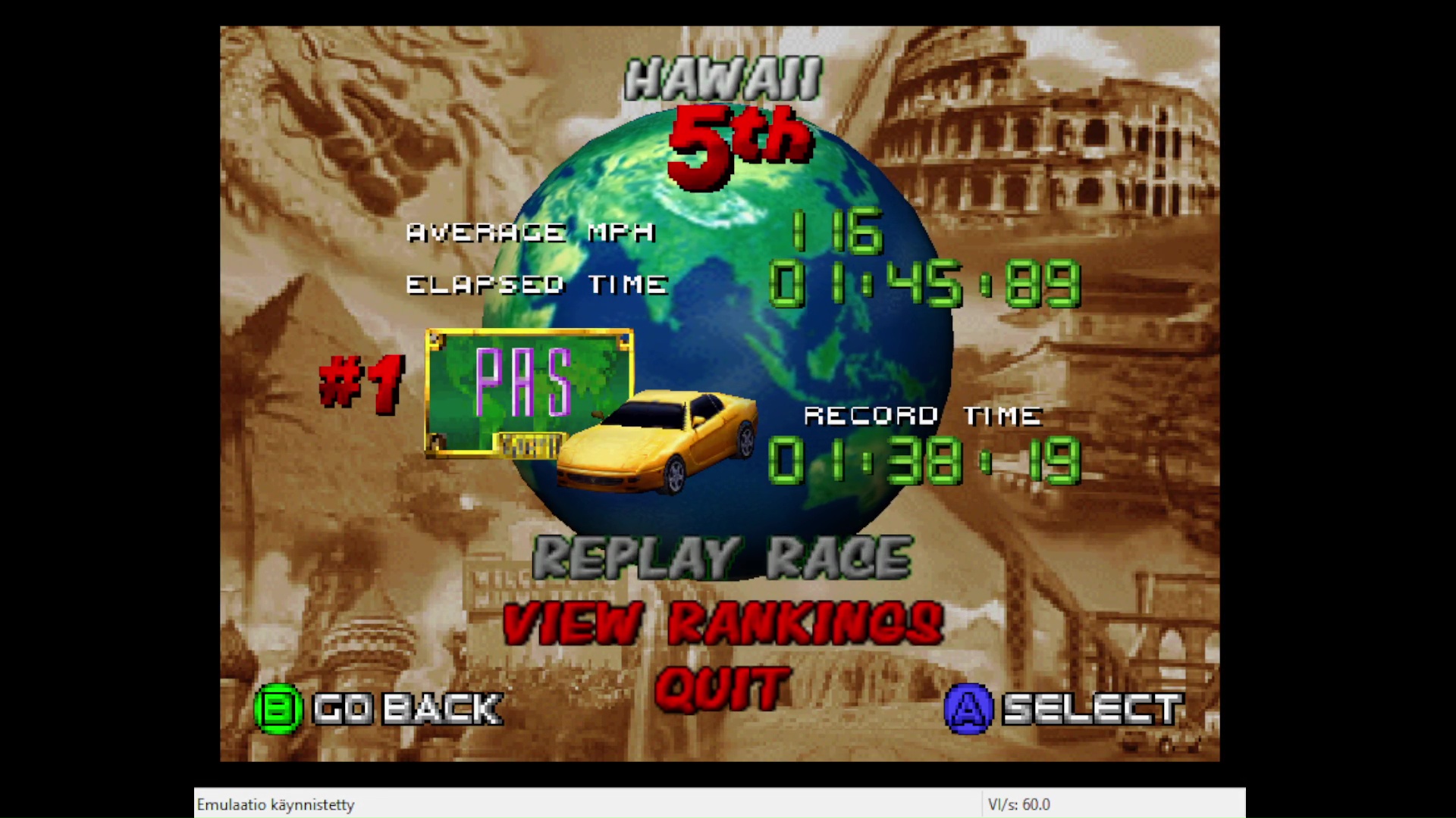 Emulation checked, game checked, Very Hard / Cruise The World / Country checked, gameplay checked, time checked, initials checked.