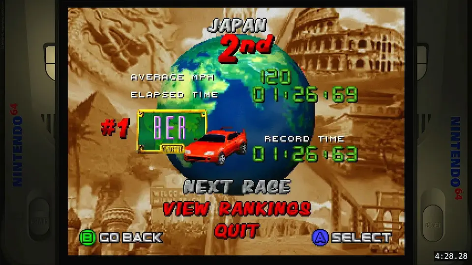 Emulation checked, game checked, Difficulty Easy / Cruise the World selected, track checked, gameplay checked, time checked, initials checked.