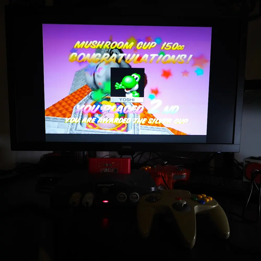 Hardware checked, game checked, Grand Prix / 150cc / Cup / Track checked, gameplay checked, time checked.