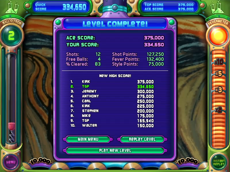This run was made using the Steam version of Peggle Nights. The Stage is 3-3 (Nooooo!!!) and the date of play was the 19th October 2025. The score achieved was 334,650.