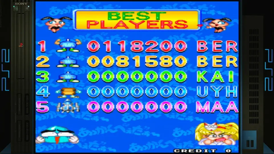 Play the game in 1 player mode with default settings *** Balloon Bomber *** No difficulty setting on , so : - Easy = 5Lives - Normal = 4Lives - Hard = 3Lives (Default) *** Cleopatra Fortune *** Always select Easy (Level 1) mode (no bonus point), in the in-game difficulty selection mode. Difficulty is chosen in the compilation menu ! *** Lunar Rescue *** No difficulty setting on , so : Easy = 6 lives Normal = 5 lives Hard = 3 lives *** Bust-A-Move Again *** Select Player VS Computer & Normal difficulty *** Qix *** As there is no global difficulty settings for the whole game, difficulty must be set in the stage difficulty menu instead *** Space Invaders '95 *** As there is no global difficulty settings for the whole game, difficulty must be set in the stage difficulty menu instead *** The Fairyland Story *** Easy = 5 Lives Normal = 3 Lives Hard = No hard setting *** Wild Western *** Easy = 6 Lives Normal = 3 Lives Hard = No hard setting |