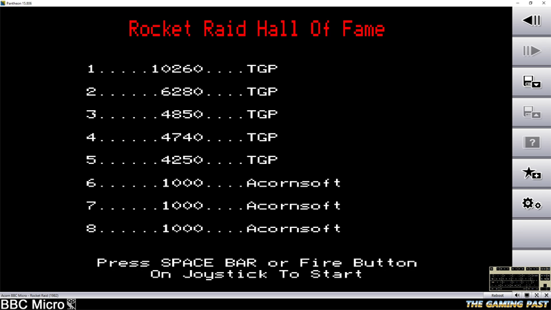 Rocket Raid is a Scramble-clone for the BBC Micro from Acornsoft. It was released in 1982 and was written by Jonathan Griffiths. Jonathan also wrote the classic Pac-man game for the Beeb, called Snapper, as well as the unusual JCB Digger.