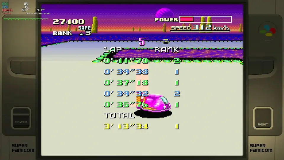 • zsnes (all versions) and snes9x emulators <=1.53 banned because inaccuracy in timing • super start allowed (pushed by other cars at start) • shortcuts allowed • practice mode: rival allowed • for best lap : use of 4 boosts on same lap allowed (1 just before the finish line on 4th lap and 3 others on last lap) • records menu is a mix of gp and practice time (pink = practice / blue = GP) • try again is allowed (3 lives = 3 retries maximum) • use of pause when the timer is started is forbidden • use of turbo button controller is forbidden |