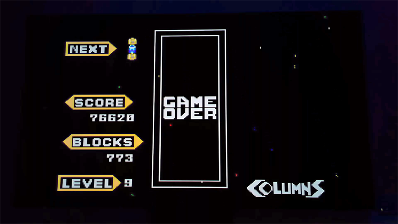 15:18 Columns reach the top of the screen. Game Over! Final score 76,620 points and 773 blocks.