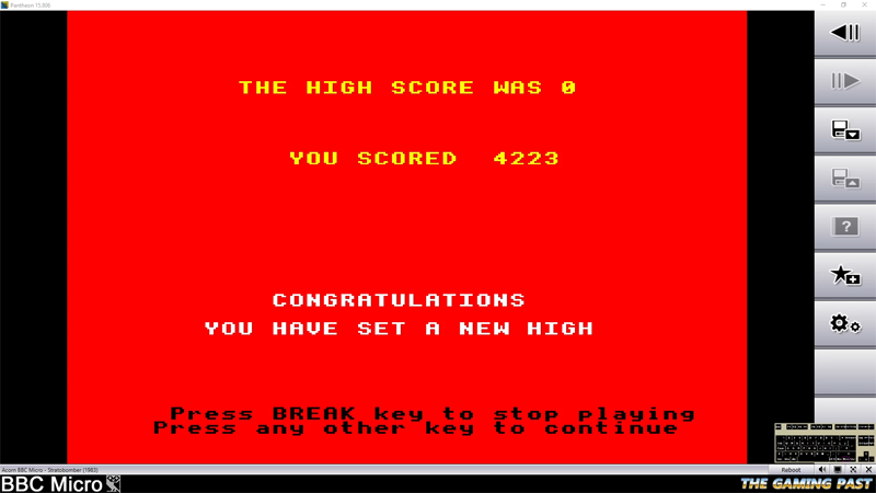 This run was made on the 12th April 2026 using the Pantheon emulator on PC. The level selected was 0 (the easiest and default level) and the score reached was 4,223 points.
