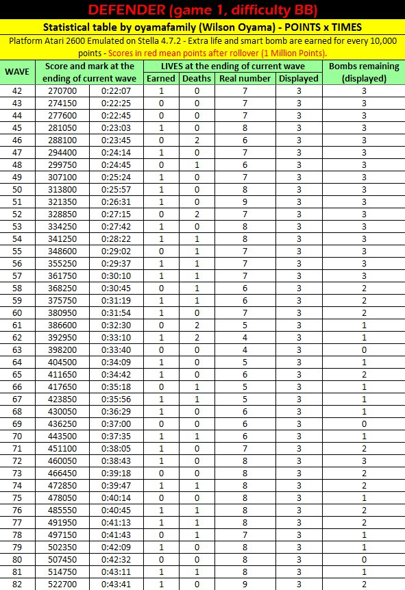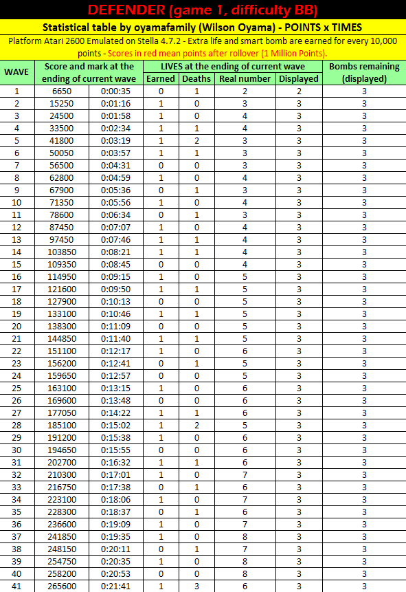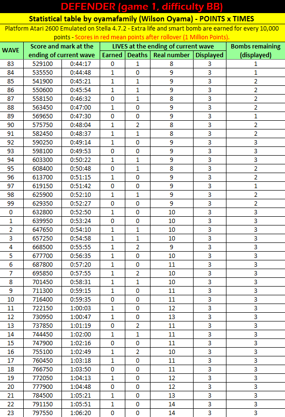 Game 1: ∙ One player ∙ Moderately fast humanoid pickup speed ∙ Moderately fast mutant and baiter speed ∙ Start on Wave 1 Left difficulty switch setting must remain in the position indicated by the leaderboard category: A/Expert: Slower ship B/Novice: Faster ship Right difficulty switch setting has no effect in a one-player variation, and can therefore be in any position at any time. Rollover: 1,000,000 4.25.21 |