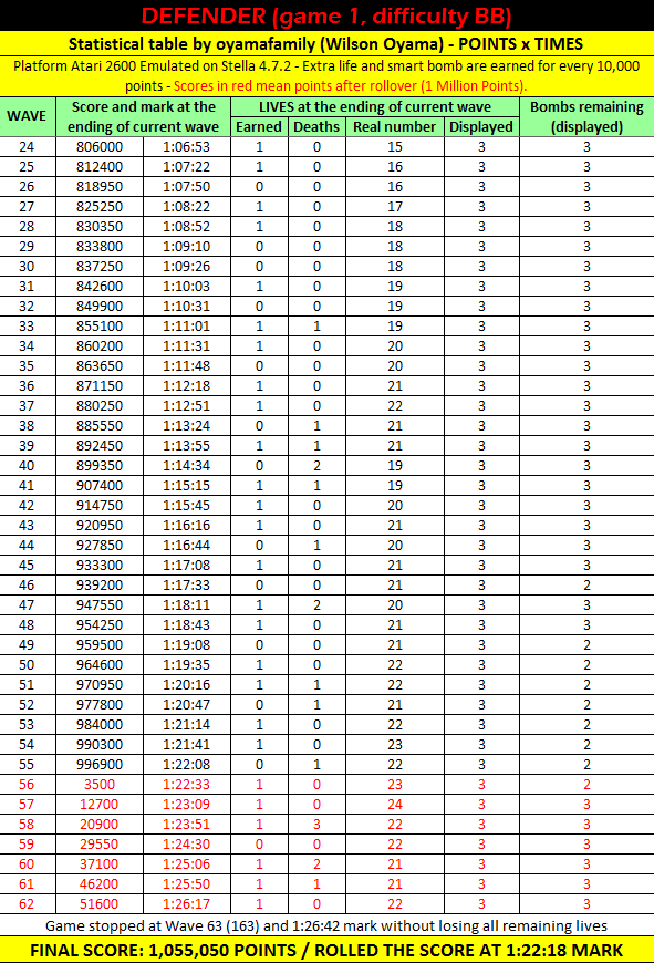 Left difficulty switch setting must remain in the B/Novice position throughout gameplay. Right difficulty switch setting may be in any position at any time. No use of trainers, cheats, saved game files, auto-fire (when not default present in-game), emulator save states, or other emulator advantages. No use of code modifications that give the player an advantage over other players. No continues. It is discouraged and may lead to voters not accepting your score to: - excessively point farm - use glitches or other game exploits |