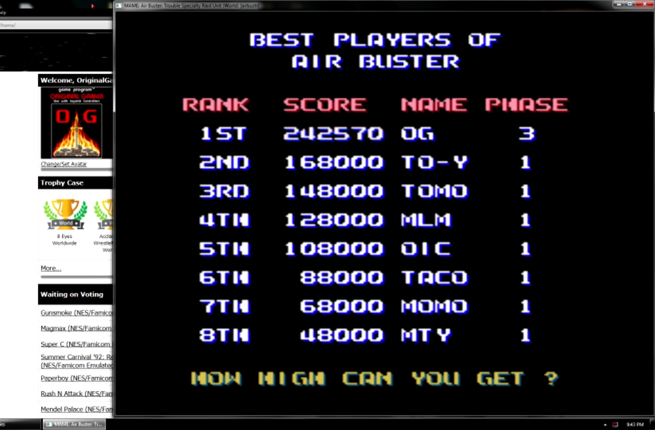 Play with default settings unless otherwise specified. If the ROM set is not mentioned, play the parent ROM. No use of trainers, cheats, saved game files, emulator save states or other emulator advantages. No use of code modifications that give the player an advantage over other players. 1 player only. No continues. In-game/internal autofire is only allowed if a game has it (enabled through hard or soft DIPs). External/MAME/cheat-based autofire is not allowed. It is discouraged and may lead to voters not accepting your score to - excessively point farm - use glitches or other game exploits You can use any emulator you want (Retropie, rain, neo geo, Coinops, Antstream, handhelds,...). If specific emulators or versions are restricted, it will be mentioned in the Specific rules. For Top 3 we encourage (but NOT mandatory) to provide: a) A full video with DIP Switches to be shown in the video (at the start or at the end of your performance). If DIP Switches are not available, Service Menu should be used instead (at the start of your performance). If no difficulty settings is available on your game, you still have to show either DIP switches or service mode showing this (if not mentioned in the specific rules). OR b) An INP file. Please state your MAME version in the comments. And add an URL where the voter can download your .inp. (We currently have no way to store those files on the server, but it is on the roadmap). For INPs: o We encourage to also show the DIPs during your video play. o Delete NVRAM before recording/viewing. Many arcade games that MAME emulates save some information (like high scores) in non-volatile ram (NVRAM), which by default MAME saves in the nvram subfolder. For some games (not all) the RNG is affected by NVRAM, so an .inp file recorded with non-empty nvram won't replay correctly on anyone else's system. o To record INP file, you require Wolfmame: You can download it here : https://github.com/mahlemiut/wolfmame/releases (or on MARP). o Record one run gameplay when using INP. |