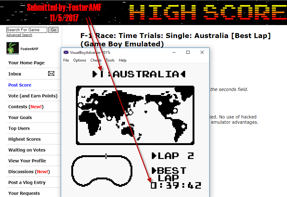 Play the game in 1 player mode with specific settings : -> Must be Play in Time Trials, Single mode (Alone on race, no other cars). -> Machine Select : Type A or Type B (Player can choose any car) * EMULATION RECOMMANDATIONS * - Internal clock of following emulators : VBA/VBA-M, SameBoy, RetroArch) is not accurate and for this reason, they are banned on lvlupscore.com -> More informations if needed : http://www.gbrunners.com/game-boy-speedrunning-explained For Top 3, we encourage (and not impose) to provide: - Emulator used (name and version). - Real time FPS (Gameboy FPS is around 59 or 60 fps), because of a leaderboard based on an in-game timer, - A video evidence because of all previously reasons. *ORIGINAL HARDWARE* No specific for now... feel free to contact game-admin if you need. * INFORMATIONS * - This game has an GamePak' battery-backed internal memory. (for saving the records) |