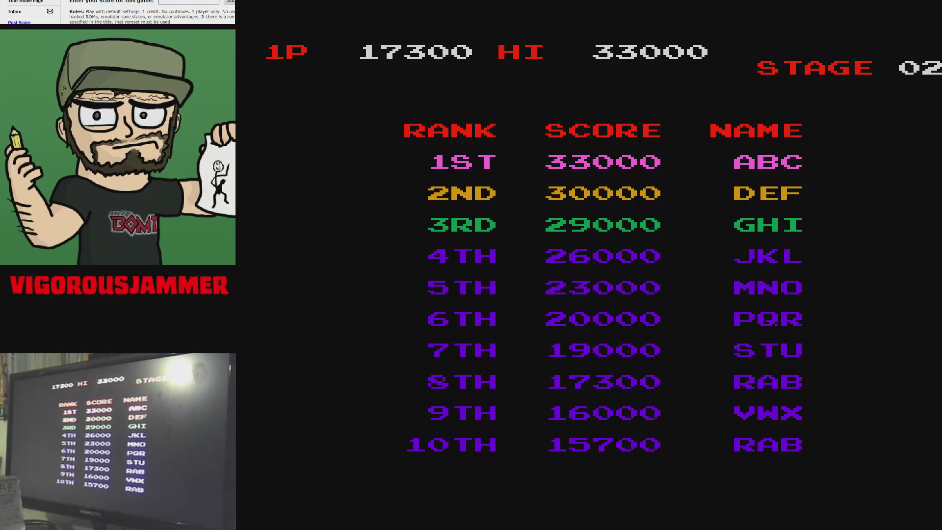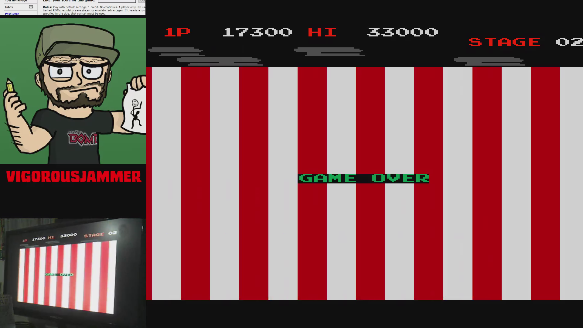 Play with default settings unless otherwise specified. If the ROM set is not mentioned, play the parent ROM. No use of trainers, cheats, saved game files, emulator save states or other emulator advantages. No use of code modifications that give the player an advantage over other players. 1 player only. No continues. In-game/internal autofire is only allowed if a game has it (enabled through hard or soft DIPs). External/MAME/cheat-based autofire is not allowed. It is discouraged and may lead to voters not accepting your score to - excessively point farm - use glitches or other game exploits You can use any emulator you want (Retropie, rain, neo geo, Coinops, Antstream, handhelds,...). If specific emulators or versions are restricted, it will be mentioned in the Specific rules. For Top 3 we encourage (but NOT mandatory) to provide: a) A full video with DIP Switches to be shown in the video (at the start or at the end of your performance). If DIP Switches are not available, Service Menu should be used instead (at the start of your performance). If no difficulty settings is available on your game, you still have to show either DIP switches or service mode showing this (if not mentioned in the specific rules). OR b) An INP file. Please state your MAME version in the comments. And add an URL where the voter can download your .inp. (We currently have no way to store those files on the server, but it is on the roadmap). For INPs: o We encourage to also show the DIPs during your video play. o Delete NVRAM before recording/viewing. Many arcade games that MAME emulates save some information (like high scores) in non-volatile ram (NVRAM), which by default MAME saves in the nvram subfolder. For some games (not all) the RNG is affected by NVRAM, so an .inp file recorded with non-empty nvram won't replay correctly on anyone else's system. o To record INP file, you require Wolfmame: You can download it here : https://github.com/mahlemiut/wolfmame/releases (or on MARP). o Record one run gameplay when using INP. |