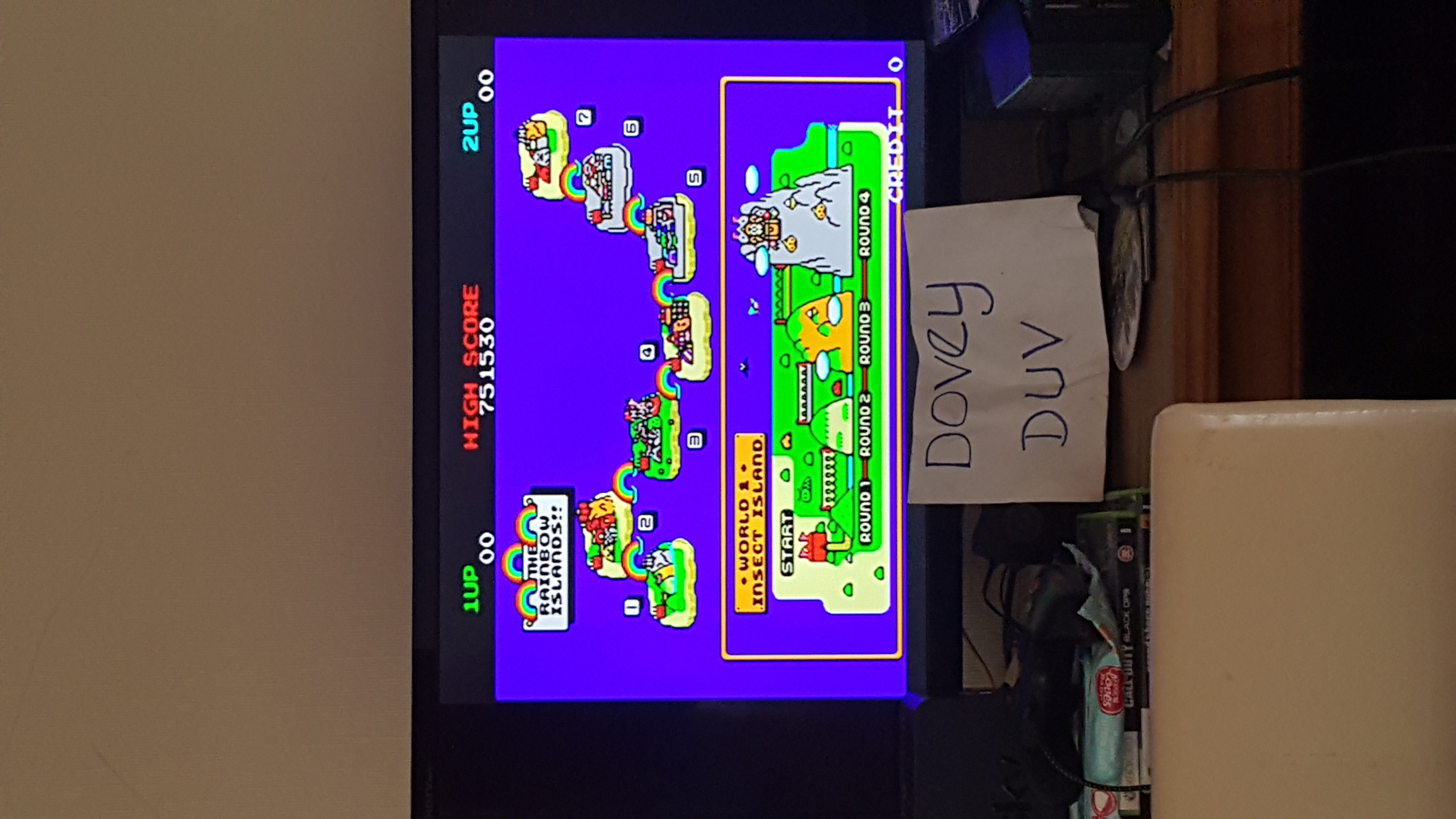 IMPORTANT: Must reset game between attempts Mame romset: rbisland Cabinet: Upright | Flip Screen: Off Service Mode: Off | Difficulty: Medium | Language: English Lives: 3 | Bonus Life: 100k, 1000k | Complete Bonus: 1 Up |