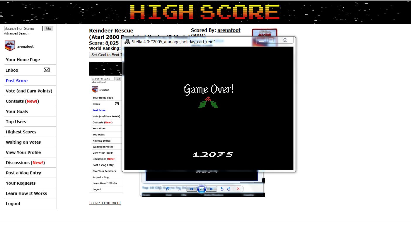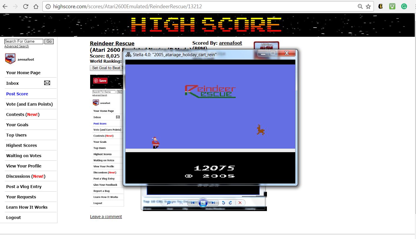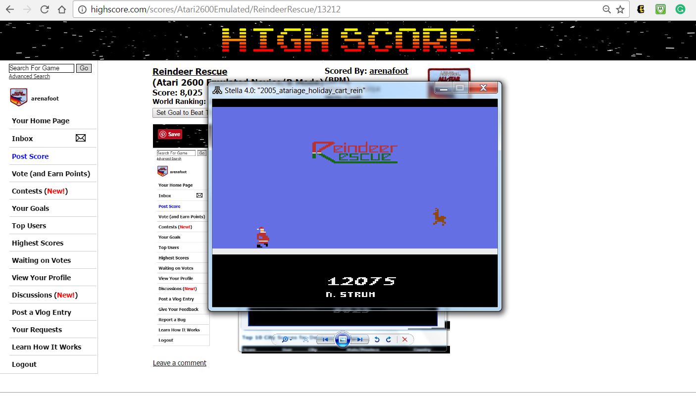 Only one game variation in this title. Game SELECT switch has no effect. Left difficulty switch setting has no effect in this title, and can therefore be in any position at any time. Right difficulty switch is player's choice, and can therefore be in any position at any time. A/Expert: Music off B/Novice: Music on Homebrew author: Bob Montgomery Released: 2005 🕹 ROM was publicly released by its author, and can be obtained here: 💾 https://atariage.com/forums/blogs/entry/1279-reindeer-rescue-bug-found/ 3.13.22 |
