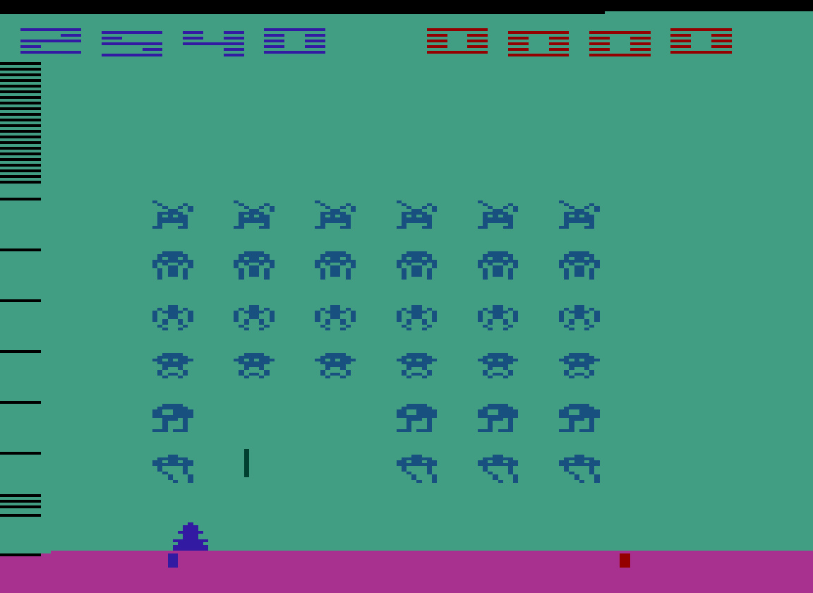 Game 1: ∙ One player ∙ Stationary shields ∙ Straight-dropping bombs ∙ Slow-dropping bombs ∙ Visible invaders ⏪ Left difficulty switch setting must remain in the position indicated by the leaderboard category: 🅰 Wide base 🅱 Narrow base ⏩ Right difficulty switch setting has no effect in a one-player variation, and can therefore be in any position at any time. 🔄 Rollover: 10,000 Author: Richard Maurer Company: Atari Released: 1980 B 10.14.24 |