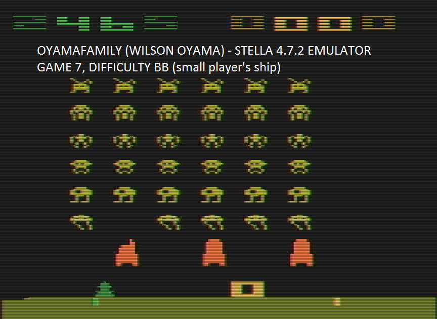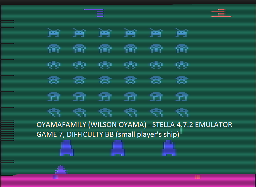 Game 7: ∙ One player ∙ Stationary shields ∙ Zig-zagging bombs ∙ Fast-dropping bombs ∙ Visible invaders ⏪ Left difficulty switch setting must remain in the position indicated by the leaderboard category: 🅰 Wide base 🅱 Narrow base ⏩ Right difficulty switch setting has no effect in a one-player variation, and can therefore be in any position at any time. 🔄 Rollover: 10,000 Author: Richard Maurer Company: Atari Released: 1980 B 10.14.24 |