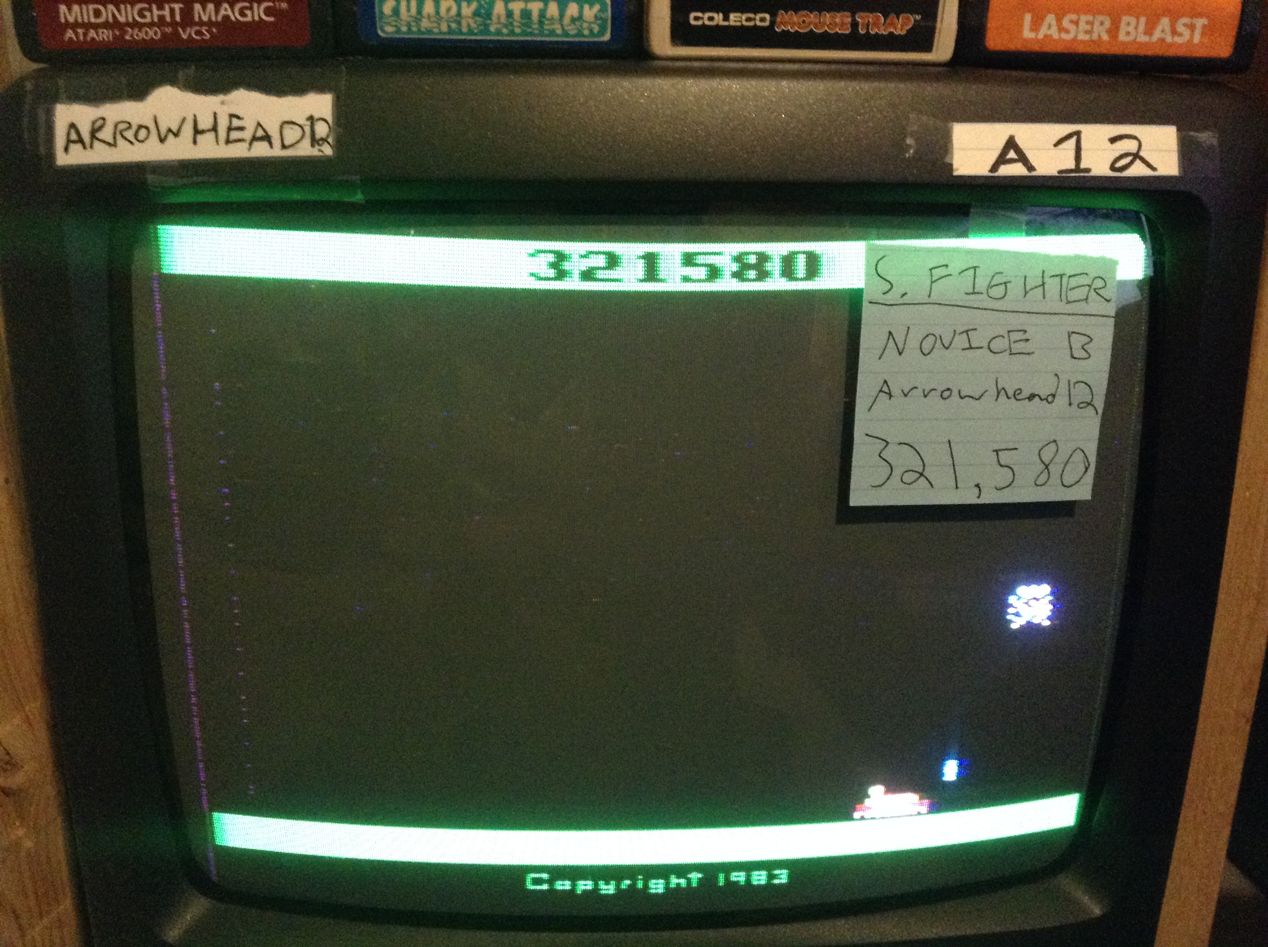 Only one game variation in this title. Game SELECT and game RESET switches both reset the game. Left difficulty switch setting must remain in the position indicated by the leaderboard category: A/Expert: Expert skill level B/Novice: Regular skill level Right difficulty switch setting must remain in the position indicated by the leaderboard category: A/Expert: Straight fire B/Novice: Guided fire Maxout: 900,000 3.15.22 |