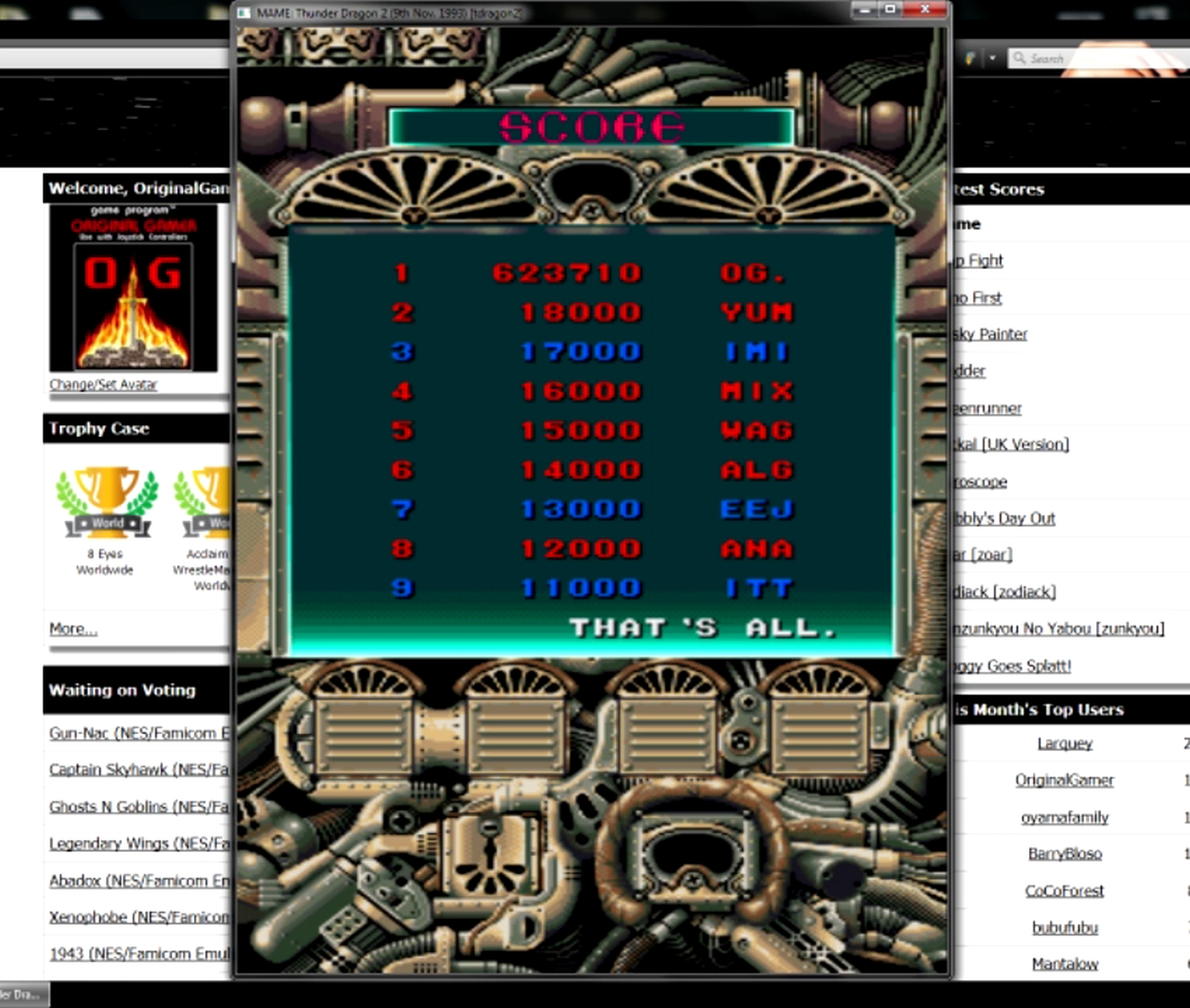 Play with default settings unless otherwise specified. If the ROM set is not mentioned, play the parent ROM. No use of trainers, cheats, saved game files, emulator save states or other emulator advantages. No use of code modifications that give the player an advantage over other players. 1 player only. No continues. In-game/internal autofire is only allowed if a game has it (enabled through hard or soft DIPs). External/MAME/cheat-based autofire is not allowed. It is discouraged and may lead to voters not accepting your score to - excessively point farm - use glitches or other game exploits You can use any emulator you want (Retropie, rain, neo geo, Coinops, Antstream, handhelds,...). If specific emulators or versions are restricted, it will be mentioned in the Specific rules. For Top 3 we encourage (but NOT mandatory) to provide: a) A full video with DIP Switches to be shown in the video (at the start or at the end of your performance). If DIP Switches are not available, Service Menu should be used instead (at the start of your performance). If no difficulty settings is available on your game, you still have to show either DIP switches or service mode showing this (if not mentioned in the specific rules). OR b) An INP file. Please state your MAME version in the comments. And add an URL where the voter can download your .inp. (We currently have no way to store those files on the server, but it is on the roadmap). For INPs: o We encourage to also show the DIPs during your video play. o Delete NVRAM before recording/viewing. Many arcade games that MAME emulates save some information (like high scores) in non-volatile ram (NVRAM), which by default MAME saves in the nvram subfolder. For some games (not all) the RNG is affected by NVRAM, so an .inp file recorded with non-empty nvram won't replay correctly on anyone else's system. o To record INP file, you require Wolfmame: You can download it here : https://github.com/mahlemiut/wolfmame/releases (or on MARP). o Record one run gameplay when using INP. |