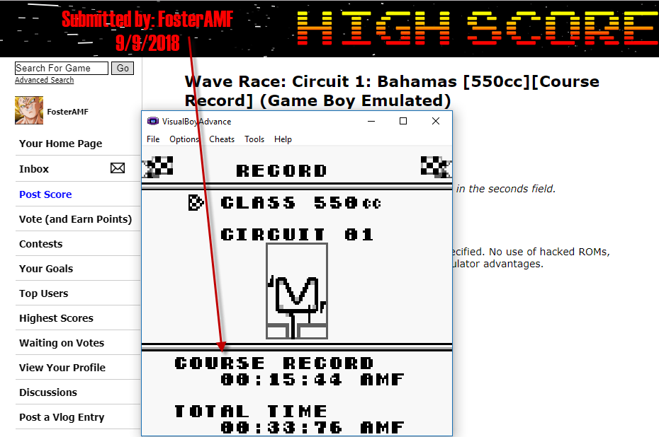 Play the game in 1 player mode with specific settings : - Choose "Practice", then enter your Rider initial, choose "Circuit" then "550cc" and finally, choose the "Circuit". - 550cc = 2 laps by race and 4 circuits (Bahamas / Hawaii / Corsica / Rio ONLY). * EMULATION RECOMMANDATIONS * - Internal clock of following emulators : VBA/VBA-M, SameBoy, RetroArch) is not accurate and for this reason, they are banned on lvlupscore.com -> More informations if needed : http://www.gbrunners.com/game-boy-speedrunning-explained For Top 3, we encourage (and not impose) to provide: - Emulator used (name and version). - Real time FPS (Gameboy FPS is around 59 or 60 fps), because of a leaderboard based on an in-game timer, - A video evidence because of all previously reasons. *ORIGINAL HARDWARE* No specific for now... feel free to contact game-admin if you need. * INFORMATIONS * - This game has an GamePak' battery-backed internal memory. (for saving the records) |