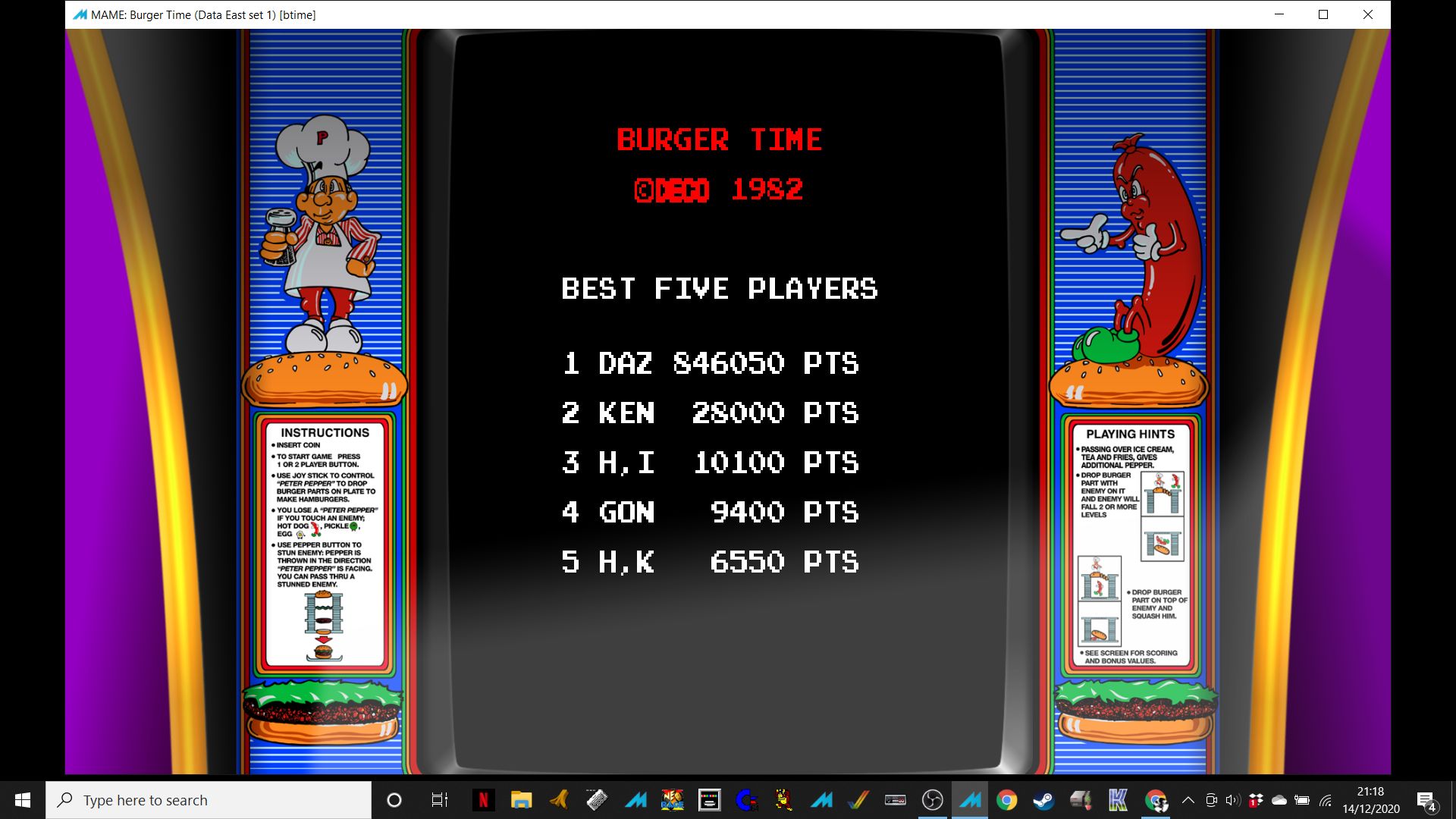 Play with default settings unless otherwise specified. If the ROM set is not mentioned, play the parent ROM. No use of trainers, cheats, saved game files, emulator save states or other emulator advantages. No use of code modifications that give the player an advantage over other players. 1 player only. No continues. In-game/internal autofire is only allowed if a game has it (enabled through hard or soft DIPs). External/MAME/cheat-based autofire is not allowed. It is discouraged and may lead to voters not accepting your score to - excessively point farm - use glitches or other game exploits You can use any emulator you want (Retropie, rain, neo geo, Coinops, Antstream, handhelds,...). If specific emulators or versions are restricted, it will be mentioned in the Specific rules. For Top 3 we encourage (but NOT mandatory) to provide: a) A full video with DIP Switches to be shown in the video (at the start or at the end of your performance). If DIP Switches are not available, Service Menu should be used instead (at the start of your performance). If no difficulty settings is available on your game, you still have to show either DIP switches or service mode showing this (if not mentioned in the specific rules). OR b) An INP file. Please state your MAME version in the comments. And add an URL where the voter can download your .inp. (We currently have no way to store those files on the server, but it is on the roadmap). For INPs: o We encourage to also show the DIPs during your video play. o Delete NVRAM before recording/viewing. Many arcade games that MAME emulates save some information (like high scores) in non-volatile ram (NVRAM), which by default MAME saves in the nvram subfolder. For some games (not all) the RNG is affected by NVRAM, so an .inp file recorded with non-empty nvram won't replay correctly on anyone else's system. o To record INP file, you require Wolfmame: You can download it here : https://github.com/mahlemiut/wolfmame/releases (or on MARP). o Record one run gameplay when using INP. |