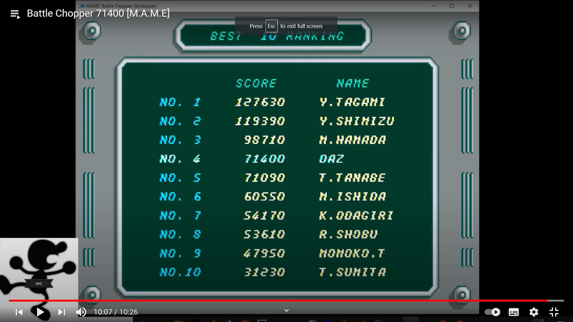 Play with default settings unless otherwise specified. If the ROM set is not mentioned, play the parent ROM. No use of trainers, cheats, saved game files, emulator save states or other emulator advantages. No use of code modifications that give the player an advantage over other players. 1 player only. No continues. In-game/internal autofire is only allowed if a game has it (enabled through hard or soft DIPs). External/MAME/cheat-based autofire is not allowed. It is discouraged and may lead to voters not accepting your score to - excessively point farm - use glitches or other game exploits You can use any emulator you want (Retropie, rain, neo geo, Coinops, Antstream, handhelds,...). If specific emulators or versions are restricted, it will be mentioned in the Specific rules. For Top 3 we encourage (but NOT mandatory) to provide: a) A full video with DIP Switches to be shown in the video (at the start or at the end of your performance). If DIP Switches are not available, Service Menu should be used instead (at the start of your performance). If no difficulty settings is available on your game, you still have to show either DIP switches or service mode showing this (if not mentioned in the specific rules). OR b) An INP file. Please state your MAME version in the comments. And add an URL where the voter can download your .inp. (We currently have no way to store those files on the server, but it is on the roadmap). For INPs: o We encourage to also show the DIPs during your video play. o Delete NVRAM before recording/viewing. Many arcade games that MAME emulates save some information (like high scores) in non-volatile ram (NVRAM), which by default MAME saves in the nvram subfolder. For some games (not all) the RNG is affected by NVRAM, so an .inp file recorded with non-empty nvram won't replay correctly on anyone else's system. o To record INP file, you require Wolfmame: You can download it here : https://github.com/mahlemiut/wolfmame/releases (or on MARP). o Record one run gameplay when using INP. |