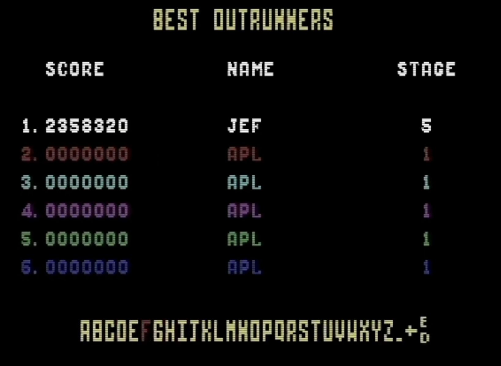 Must be played on the European version (released by US Gold). This version is identified by not having a course selection screen. Courses are normally loaded by selecting them from the tape or disk manually, unless a cracktro works around this limitation. This version also has no yellow color in the player's car / passengers sprites (unlike the US version). European version normally also doesn't offer a map overview with distance driven at game over, while the US version does. (although beware that the Lurid & Tricycle hack ported this feature from the US release over to the European release) Be careful of the following: It can happen during game play that the game skips Stage 4 or awards you a double bonus when finalizing the Stage 5 (end of game bonus). All these runs, no matter if done on purpose or by accident, will be disqualified (even after they have been accepted by voters). It can also happen that you don't get enough bonus at the end of Stage 5. You are allowed to add the correct amount of bonus to your final score when this happens (see i.e. Stevengton score EMU PAL Course A). SO VIDEO GAMEPLAY IS MANDATORY. Do not play this on the Lurid & Tricycle hack, because this hack has some oddities that other versions do not suffer from. This version can be identified by having 8 digits in the score (both in game and on the game over leaderboard). This should be 7 digits always. |