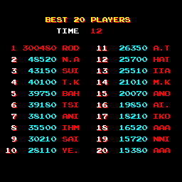 Play with default settings unless otherwise specified. If the ROM set is not mentioned, play the parent ROM. No use of trainers, cheats, saved game files, emulator save states or other emulator advantages. No use of code modifications that give the player an advantage over other players. 1 player only. No continues. In-game/internal autofire is only allowed if a game has it (enabled through hard or soft DIPs). External/MAME/cheat-based autofire is not allowed. It is discouraged and may lead to voters not accepting your score to - excessively point farm - use glitches or other game exploits You can use any emulator you want (Retropie, rain, neo geo, Coinops, Antstream, handhelds,...). If specific emulators or versions are restricted, it will be mentioned in the Specific rules. For Top 3 we encourage (but NOT mandatory) to provide: a) A full video with DIP Switches to be shown in the video (at the start or at the end of your performance). If DIP Switches are not available, Service Menu should be used instead (at the start of your performance). If no difficulty settings is available on your game, you still have to show either DIP switches or service mode showing this (if not mentioned in the specific rules). OR b) An INP file. Please state your MAME version in the comments. And add an URL where the voter can download your .inp. (We currently have no way to store those files on the server, but it is on the roadmap). For INPs: o We encourage to also show the DIPs during your video play. o Delete NVRAM before recording/viewing. Many arcade games that MAME emulates save some information (like high scores) in non-volatile ram (NVRAM), which by default MAME saves in the nvram subfolder. For some games (not all) the RNG is affected by NVRAM, so an .inp file recorded with non-empty nvram won't replay correctly on anyone else's system. o To record INP file, you require Wolfmame: You can download it here : https://github.com/mahlemiut/wolfmame/releases (or on MARP). o Record one run gameplay when using INP. |