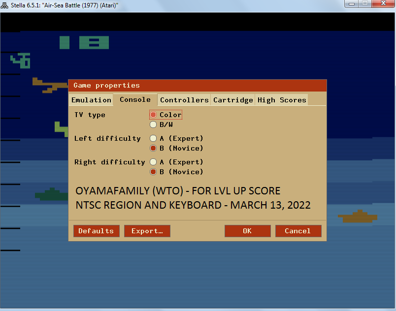 Left difficulty switch setting may be in any position at any time. Right difficulty switch setting must remain in the B/Novice position throughout gameplay. No use of trainers, cheats, saved game files, auto-fire (when not default present in-game), emulator save states, or other emulator advantages. No use of code modifications that give the player an advantage over other players. No continues. It is discouraged and may lead to voters not accepting your score to: - excessively point farm - use glitches or other game exploits |