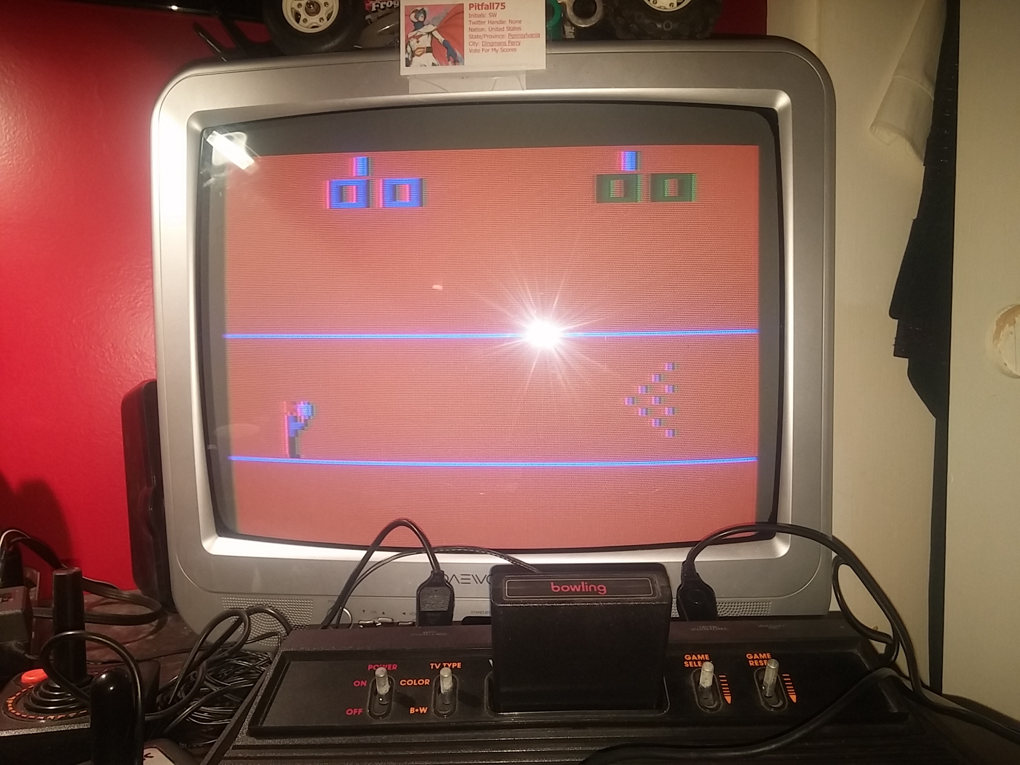 Game 1: The player can curve the ball either up or down after it is thrown. Ball remains travelling in the direction selected until the roll has been completed. Left difficulty switch setting must remain in the position indicated by the leaderboard category: A/Expert: Hard to strike B/Novice: Normal strike capability Right difficulty switch setting has no effect in a one-player variation, and can therefore be in any position at any time. ⚠For Diff A submissions, the evidence must show proof that the player's difficulty switch was in the A/Expert position throughout gameplay. 🥇 Maxout: 300 A 4.10.22 |